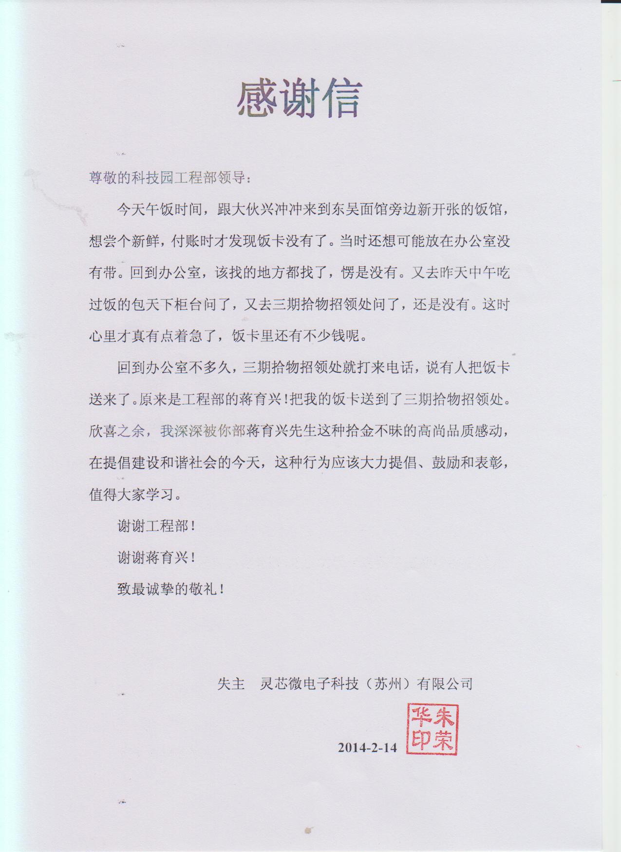 金鸡湖区域项目事业部收到感谢信1封